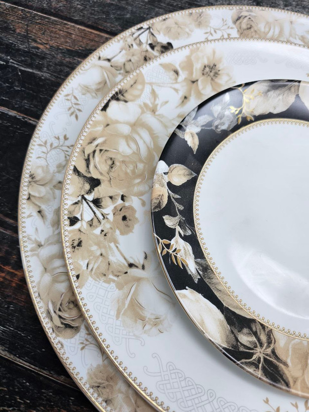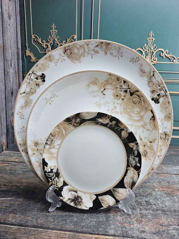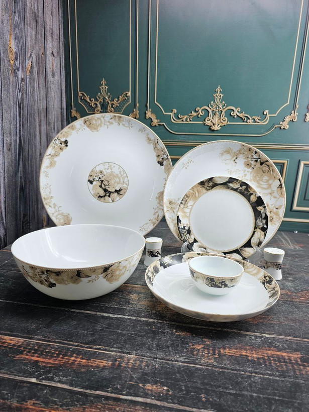 با سرویس بینظیر طرح لونا، میز پذیرایی شما جلوهای خاص و منحصربهفرد پیدا میکند. تلفیقی از رنگهای کرم، مشکی و طلایی با گلهای رز کلاسیک و نقوش طلادوزی شده، این سرویس را به انتخابی خاص برای سلیقههای خاص تبدیل کرده است.