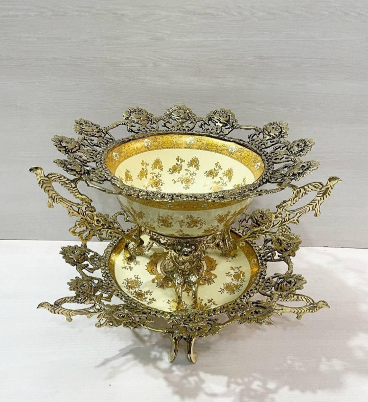 یک ست بسیار زیبا و لوکس با ترکیب هنر چینی و فلزکاری برنجی، مناسب برای دکوراسیون منزل، پذیرایی مجلل و هدیه خاص.