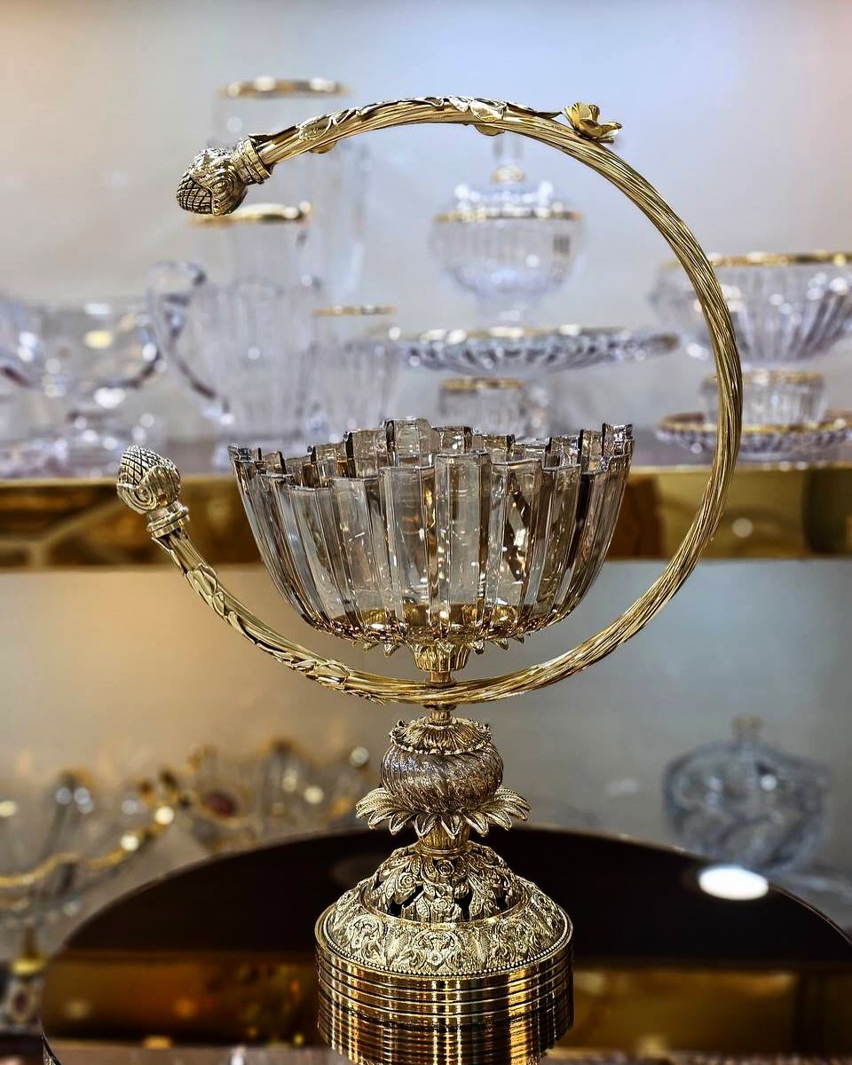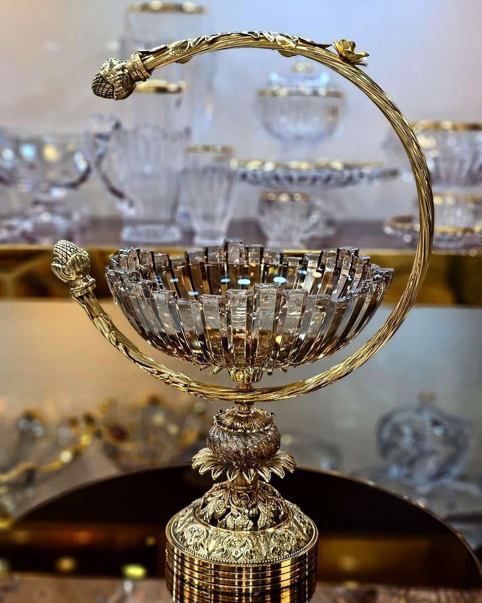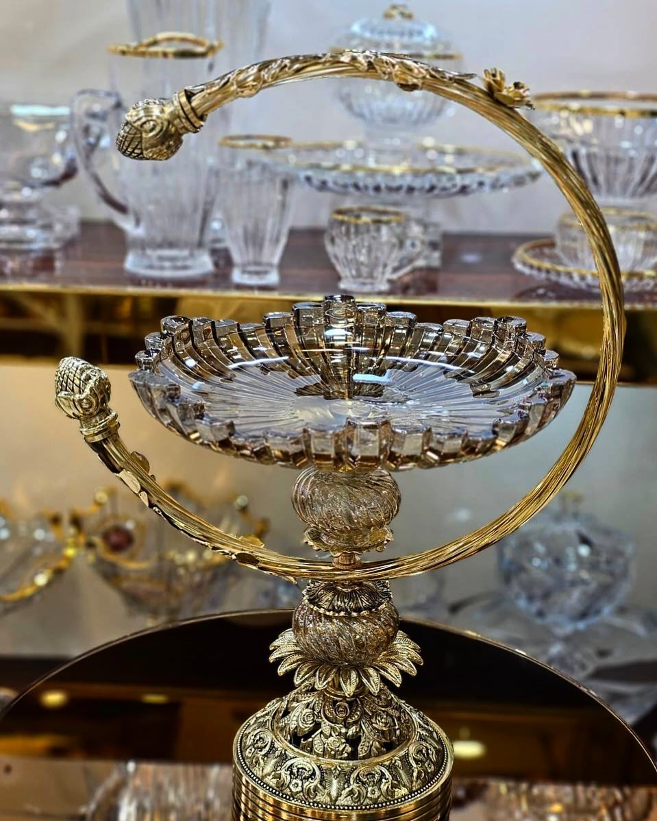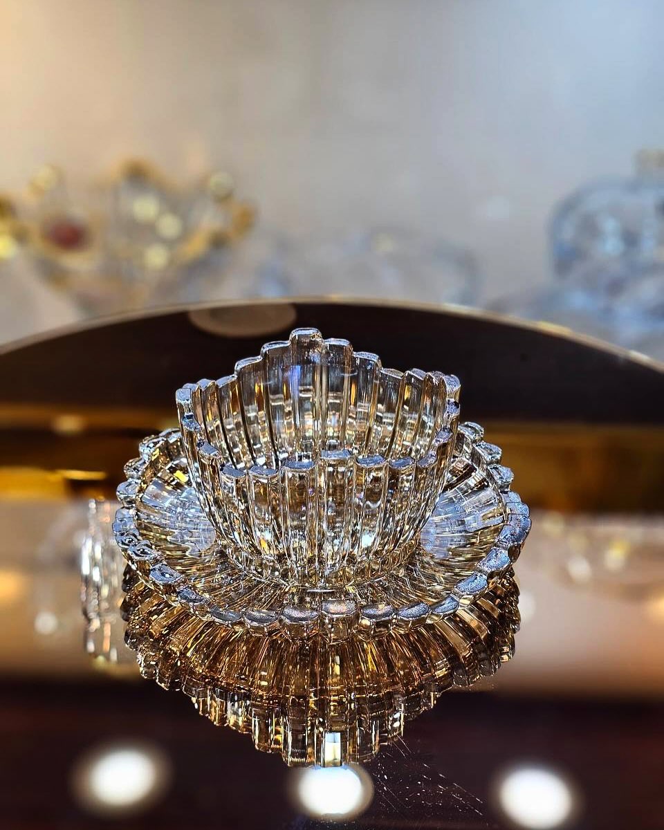 سرویس کریستال برلین با پایه آمیتیس، ترکیبی بینظیر از ظرافت و اصالت است که با طراحی لوکس و جزئیات چشمگیر، جلوهای خاص به میز پذیرایی شما میبخشد. این سرویس از کریستال شفاف و باکیفیت ساخته شده و پایههای آن با آبکاری طلا و طرحهای هنرمندانه، زیبایی و ماندگاری دوچندان یافته است.