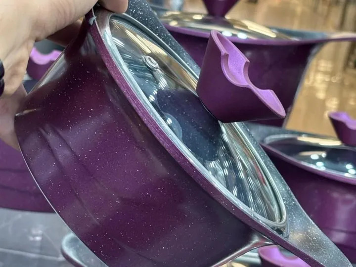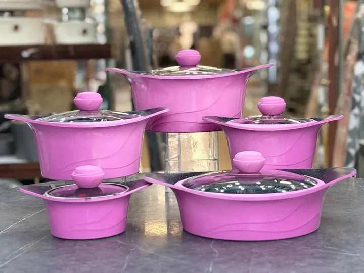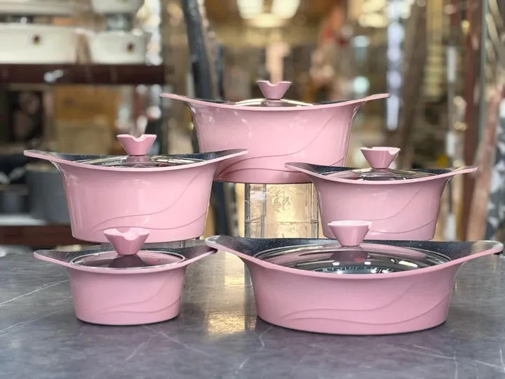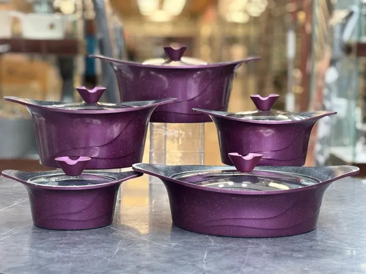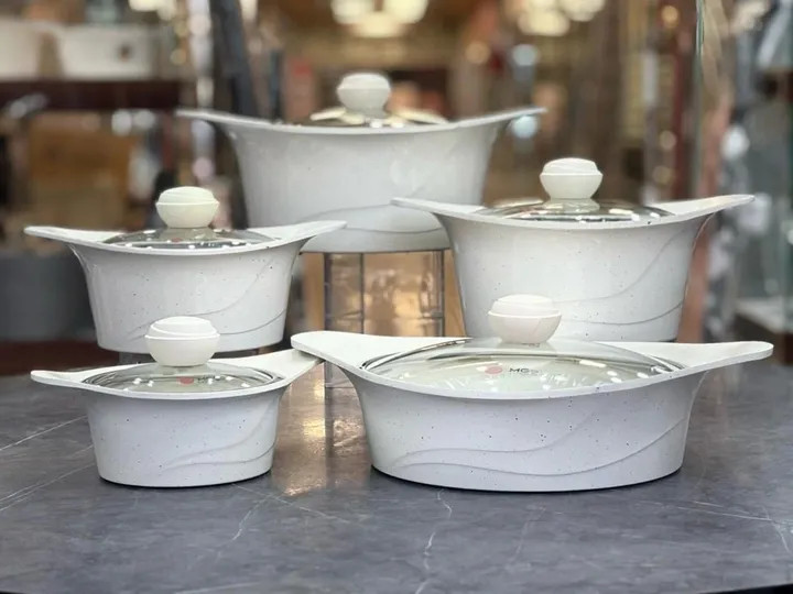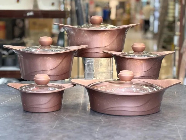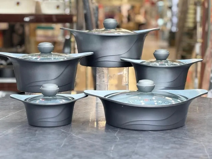 🔥 ۱۲ پارچه کامل شامل ۵ قابلمه در سایزهای مختلف + درب شیشهای نشکن با سوپاپ خروج بخار دو عدد دستگیره
