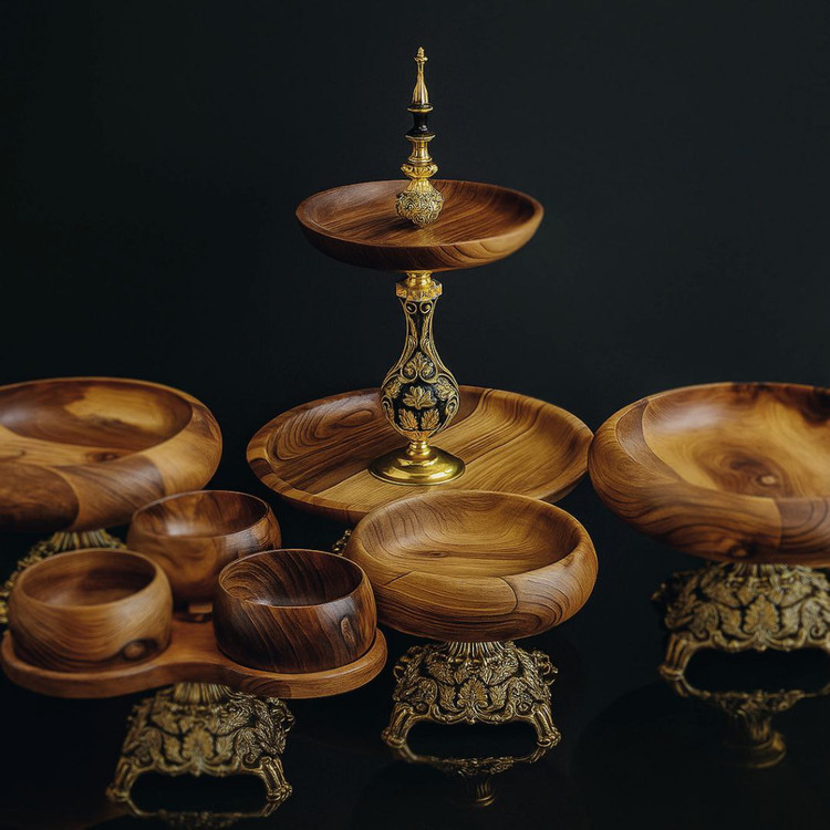 🪵 ست ظروف چوبی لوکس با پایههای برنجی دستساز 🪔