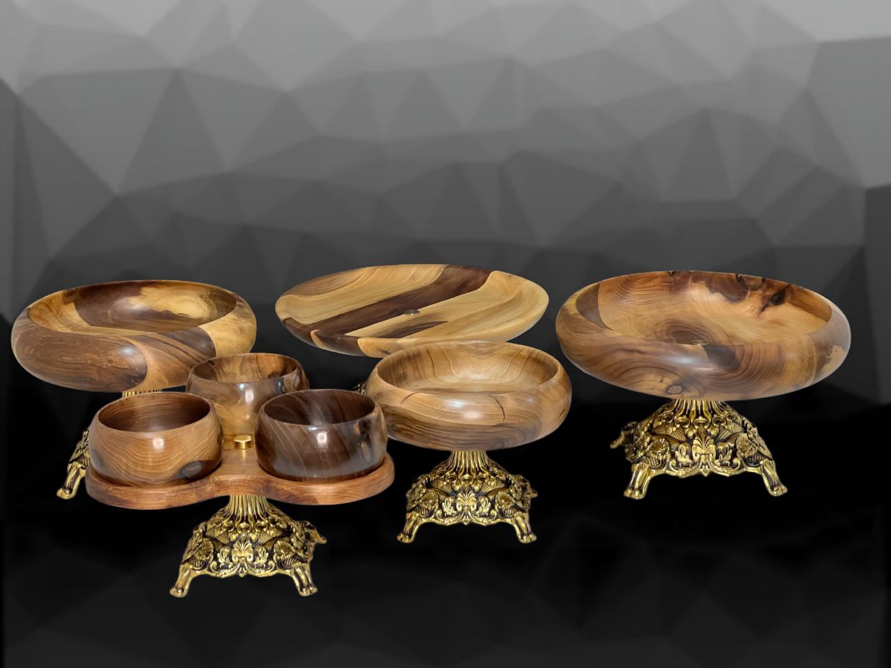 🪵 ست ظروف چوبی لوکس با پایههای برنجی دستساز 🪔