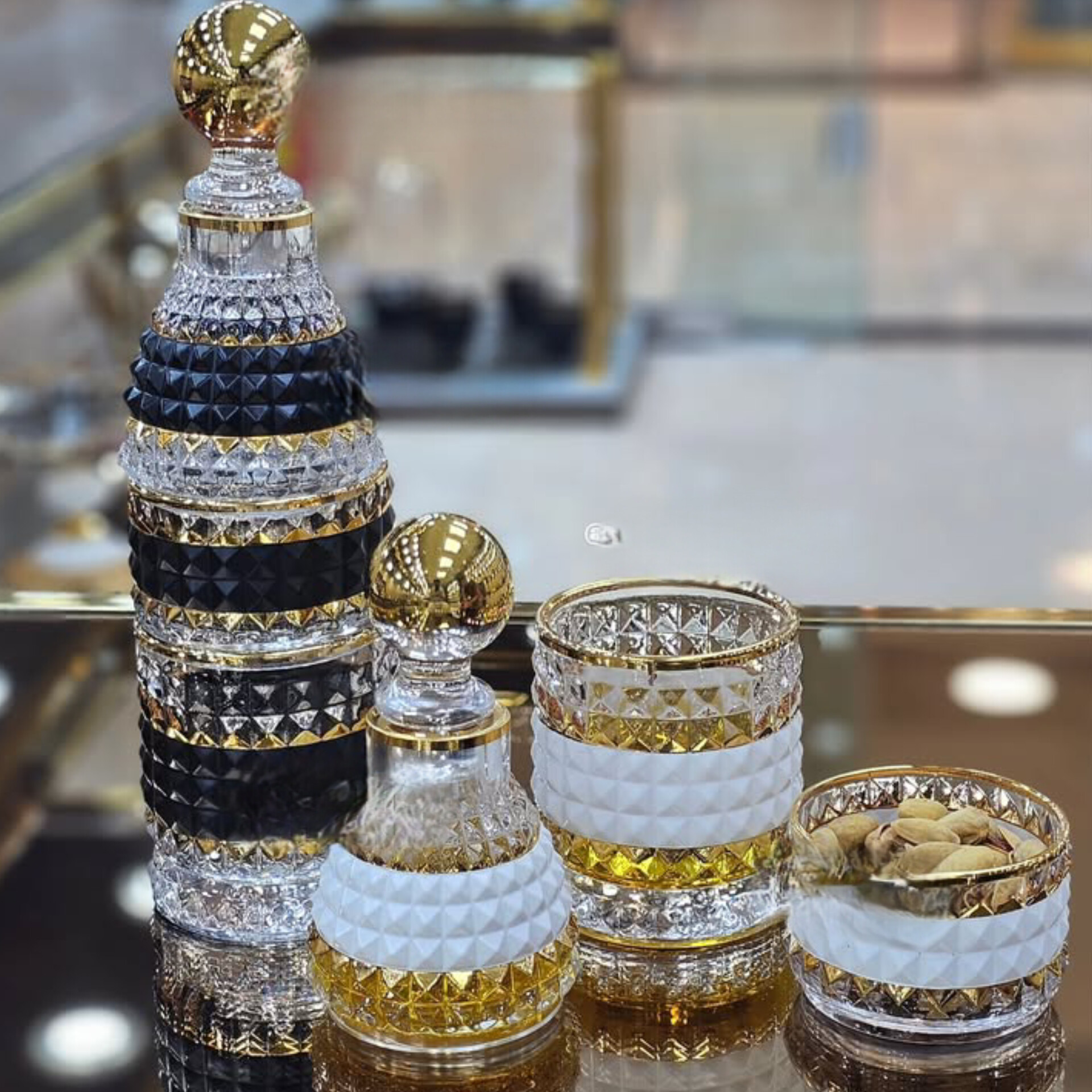 ست کریستالی فوقالعاده شیک با طراحی مدرن و تراشهای ظریف، مناسب برای سرو نوشیدنی، آجیل و مزه.