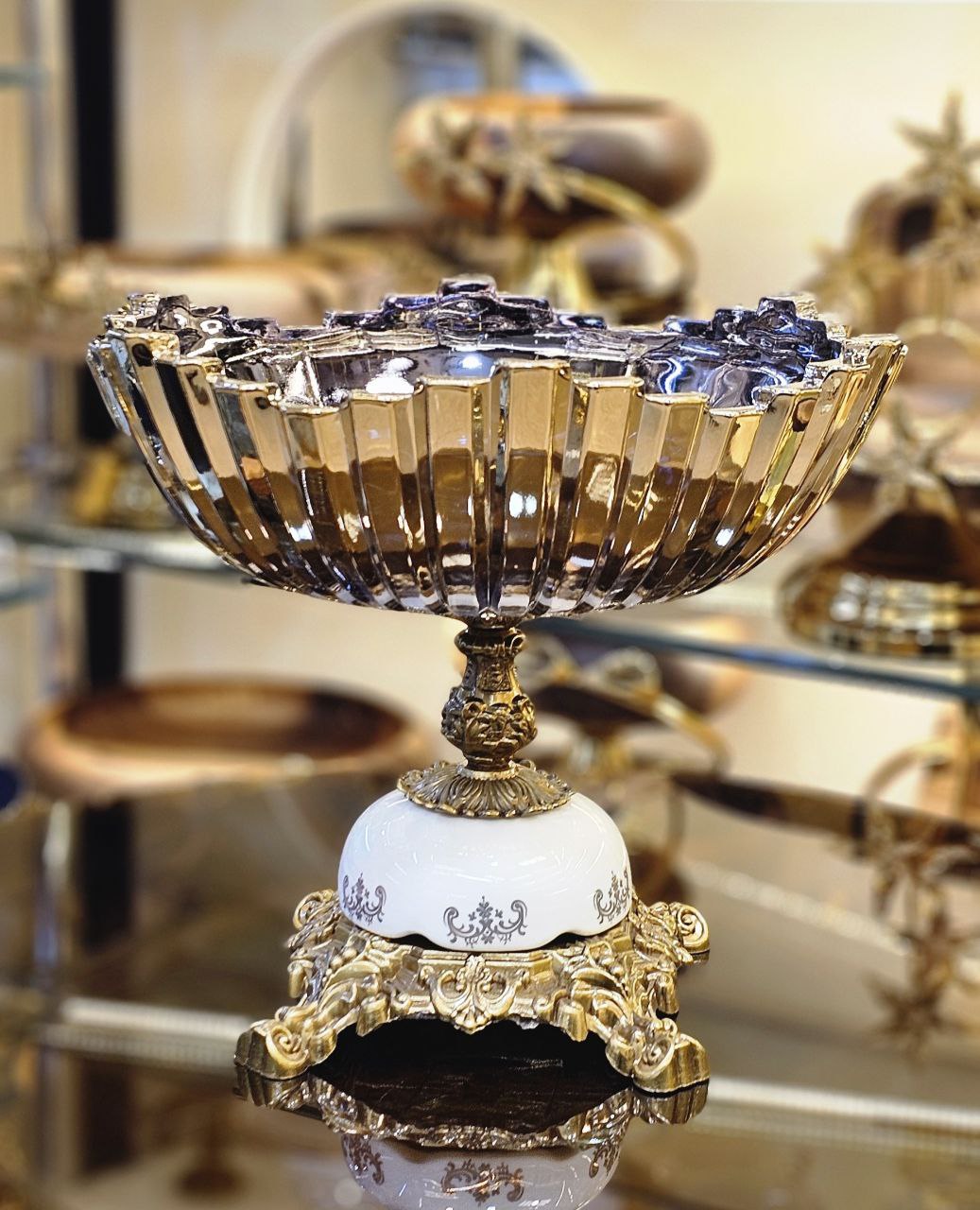 🔹 کریستال شفاف با برشهای زیبا + پایههای طلایی با جزئیات هنری